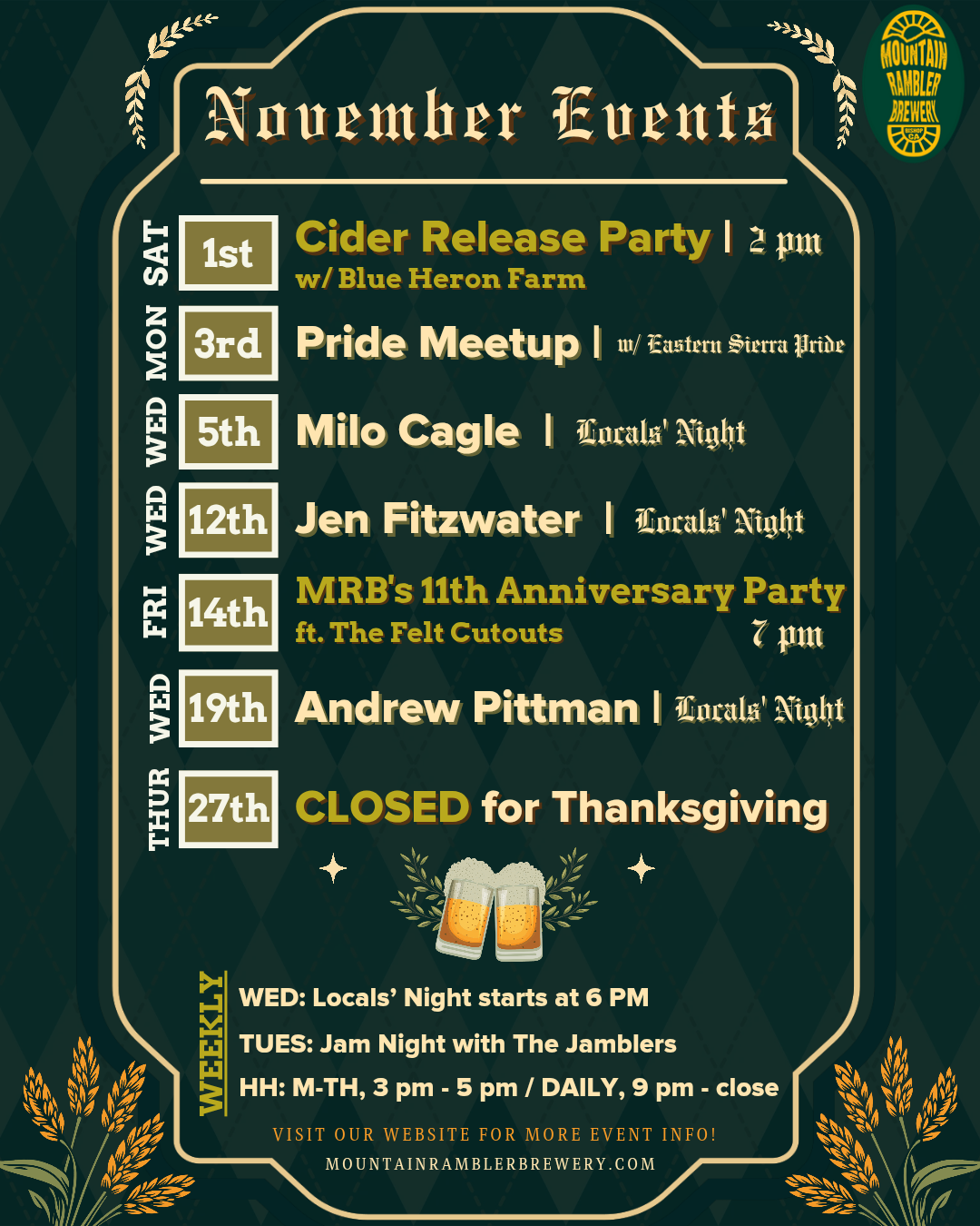 11th Anniversary Party, Cider Collab with local farm Blue Heron, Live Music! Join us and foster music in the Eastern Sierra.